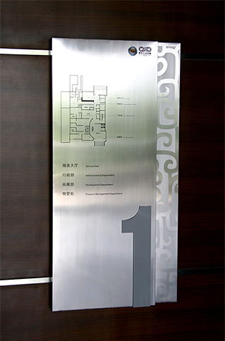 導視門牌制作中常用到的材質有,拉絲不銹鋼板、鋁板、亞克力板、led/熒光燈光源、鋼化玻璃、石材、木材等。